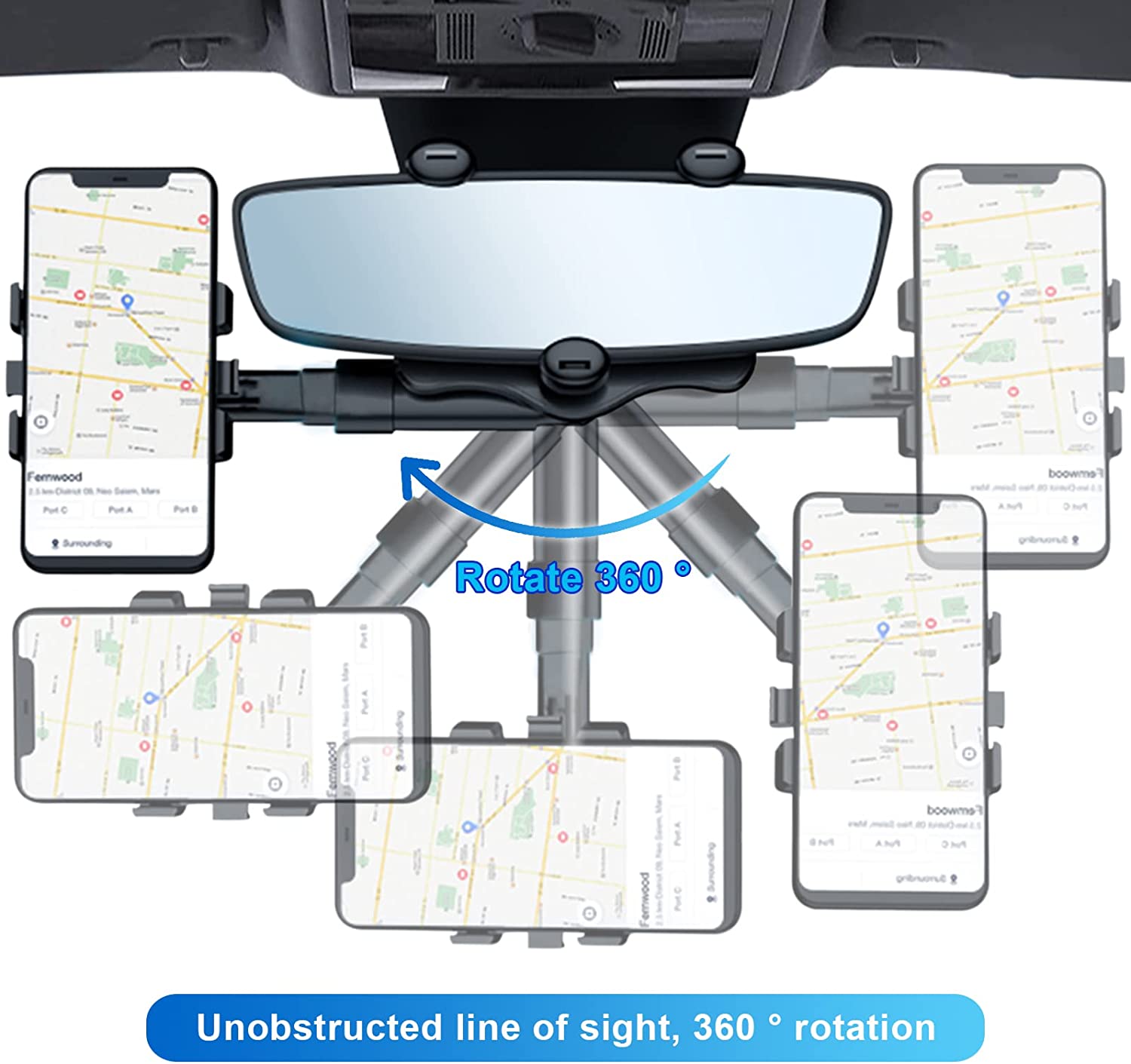 New version Firmly Locked Rearview-mirror phone holder that adopts a 360°rotating structure for Phones, Maps, GPS and Handsfree drive.