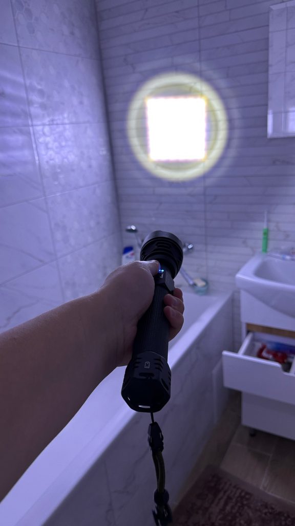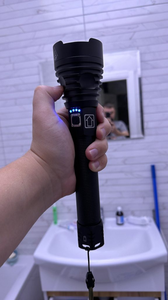 The flashlight is bright enough, there was a booklet, a short yuzby cord, a tripod handle, although the charge indicator shows that the battery is on its breath, it’s ok