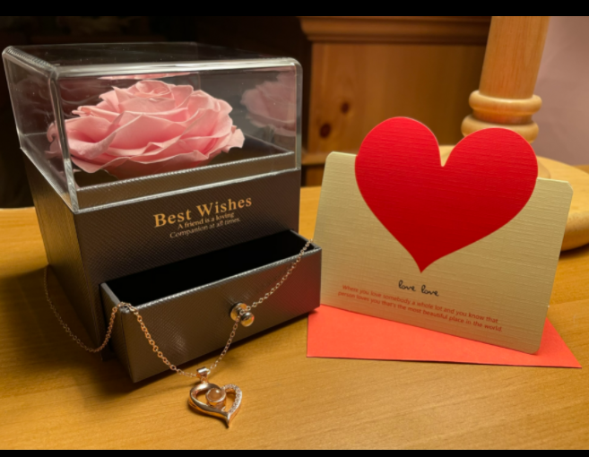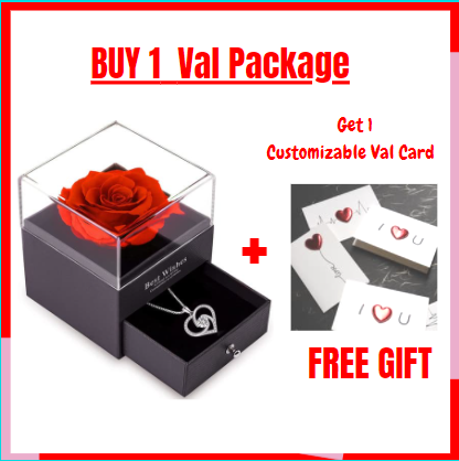 1 Preserved Eternal Rose + 1 Jewelry Box + 1 Heart Necklace + 1 Gift Bag + Valentines Card(Free gift). Give her the box, tell her about eternal rose, let her guess whatās in the drawer.