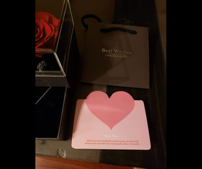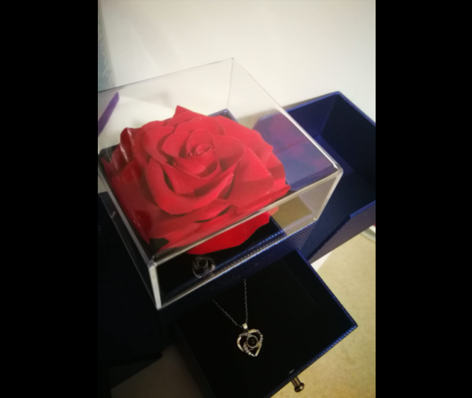 Simply gorgeous!!! Bought this eternal rose for my daughter as a Valentineās Day gift. I ordered it yesterday and it got here today, one day before Valentineās Day. She loved it!!! I couldnāt wait to give it to her tomorrow. She was so happy to get it and the necklace is beautiful as well. We were so surprised with all the ālove youāsā inside the charm.
